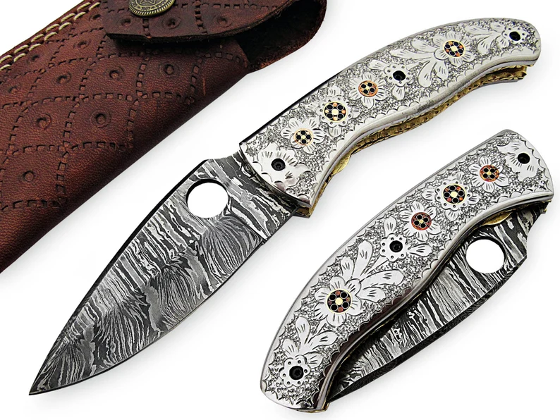 9''Inches Damascus Steel Folding Knife with Leather Sheath, Totally Handmade Engraved Brass Handle, Pocket knife, Best Gift 9”Inches Damascus Steel ...