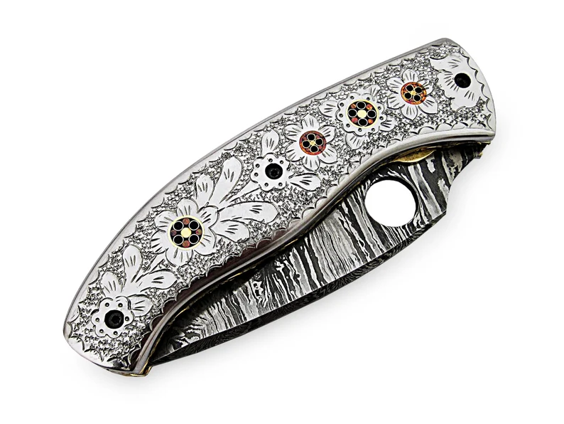 Handle Material: Handmade Engraved D2 Steel, Brass Mosaic Pins, Brass thumb pins