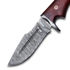 This custom handmade Damascus Bobcat knife is a masterpiece, featuring a 10-inch overall length with a 5-inch Damascus steel blade that showcases a stunning clip twist pattern. The blade’s distinctive pattern is a hallmark of Damascus steel, making each knife truly unique.