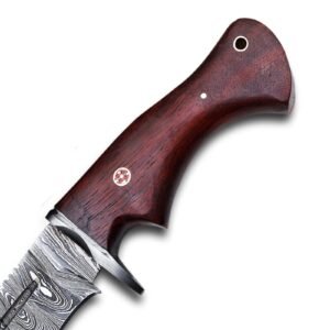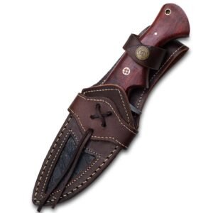 The handle is crafted from rich red padouk wood, providing a comfortable and ergonomic grip that complements the knife’s sleek design. The knife comes with a premium leather sheath, ensuring safe storage and carry.
