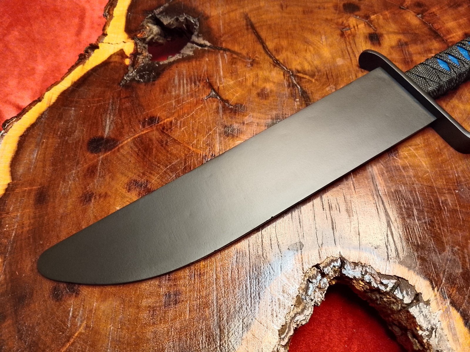 This custom handmade pair of Kangfu knives is designed for training purposes, featuring premium quality construction and a durable powder-coated finish. Each knife measures 18 inches in overall length, with a 13-inch blade and a 5-inch handle.