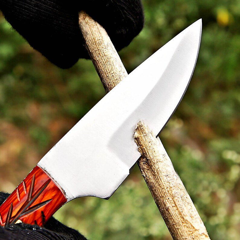 This exquisite custom handmade skinner knife features a razor-sharp stainless steel blade paired with a beautifully carved wooden handle, designed for both elegance and performance. The detailed woodwork ensures a firm grip and adds a touch of artistry, while the sturdy full-tang design delivers unmatched strength and durability. Comes with a premium, hand-tooled leather sheath for safe carrying and classic style.