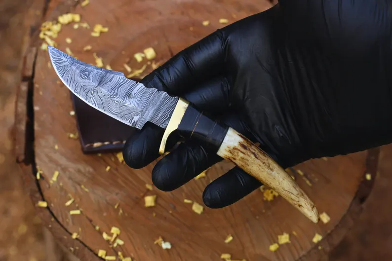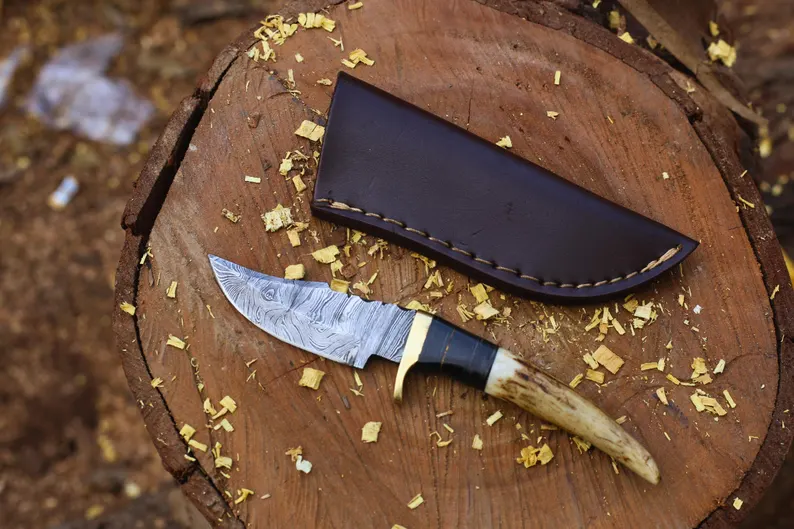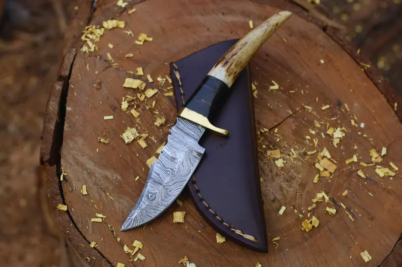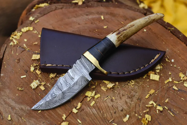 • Hand-Forged Damascus Steel Skinner Knife: Stag Horn Handle, Leather Sheath