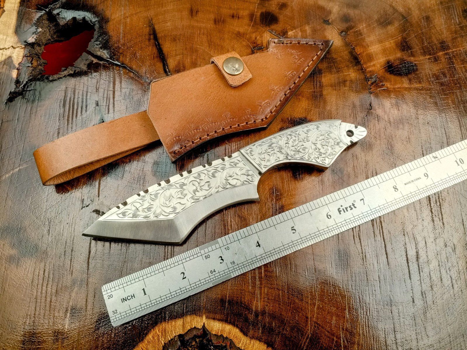 This exceptional skinning knife is a masterpiece of handmade craftsmanship, featuring a beautifully designed blade with a custom engraving. The knife measures 8 inches in overall length, with a 4-inch blade and a 4-inch handle.